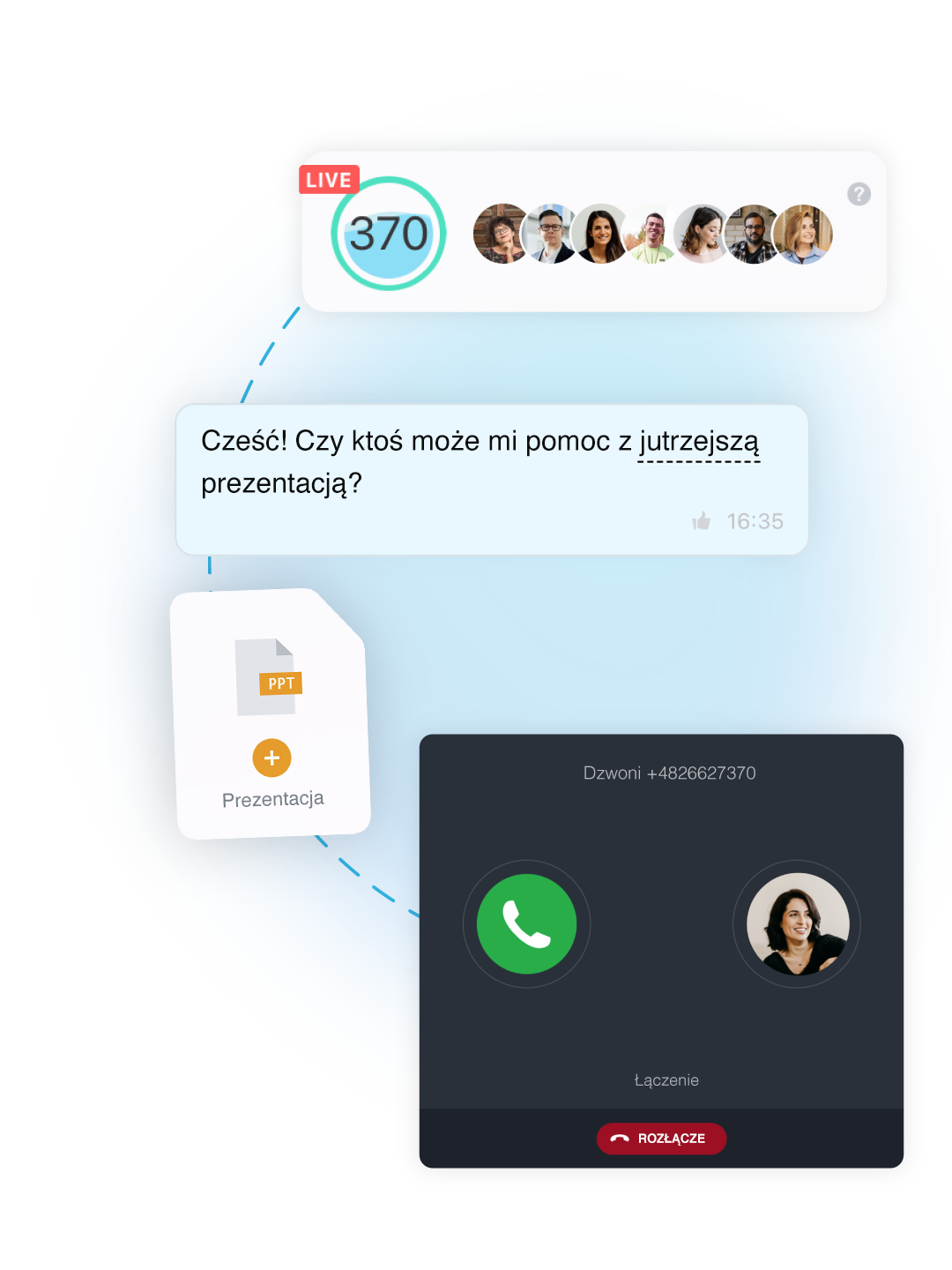 Nieograniczona liczba grupowych i indywidualnych czatów roboczych zawsze dostępna – a także Otwarte Linie, dialogi z użytkownikami zewnętrznymi, wymiana plików i powiadomienia.